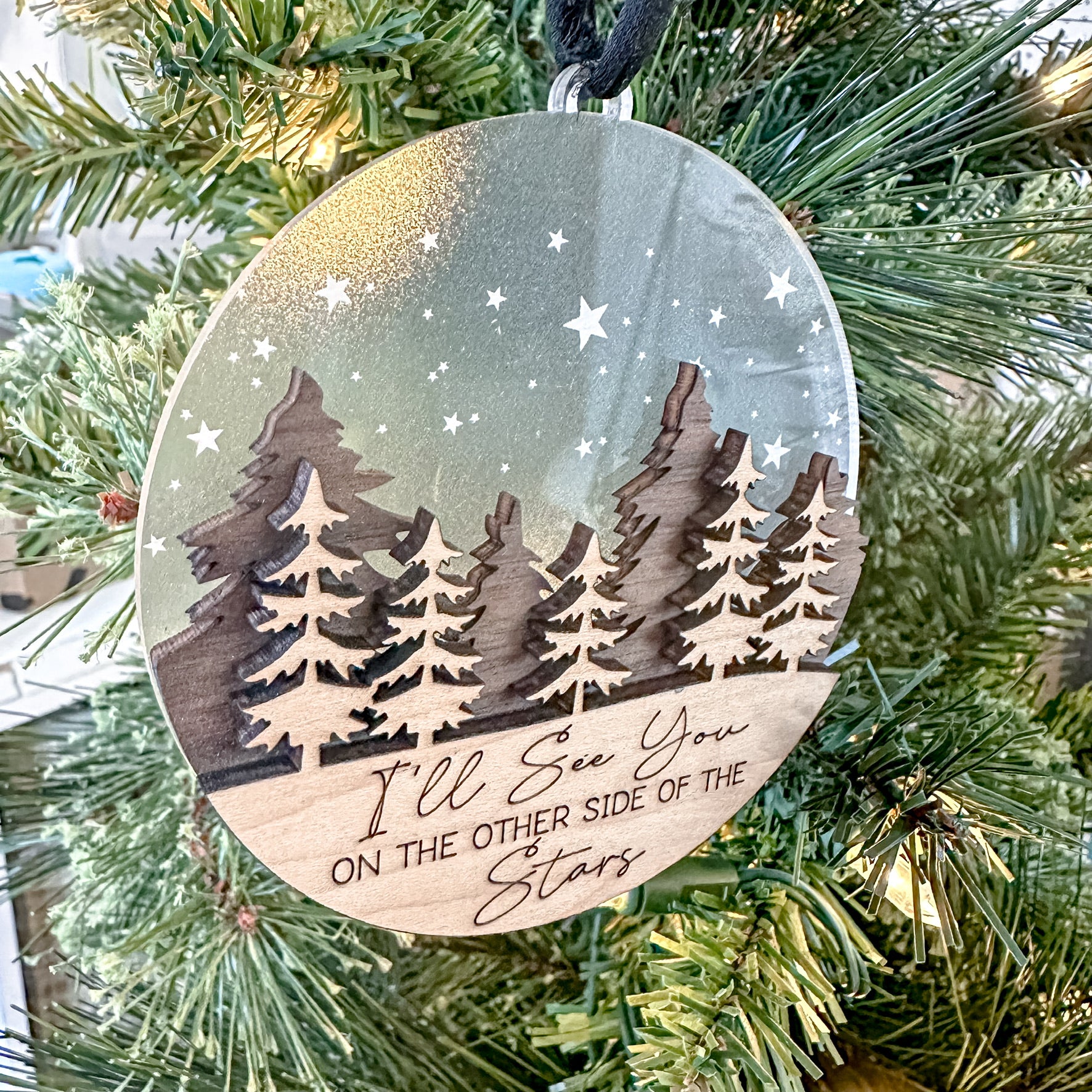 Remember your lost loved ones with this beautiful memorial ornament. It features a laser cut winter scene on an engraved frosted acrylic background, which beautifully reflects the lights on your tree.