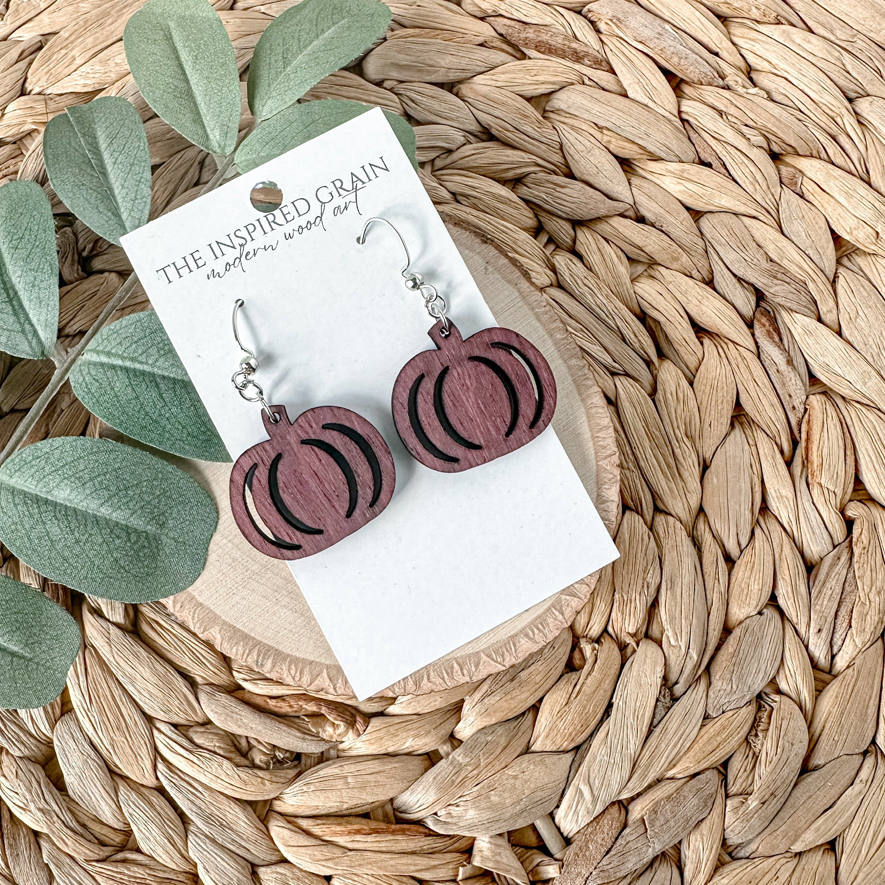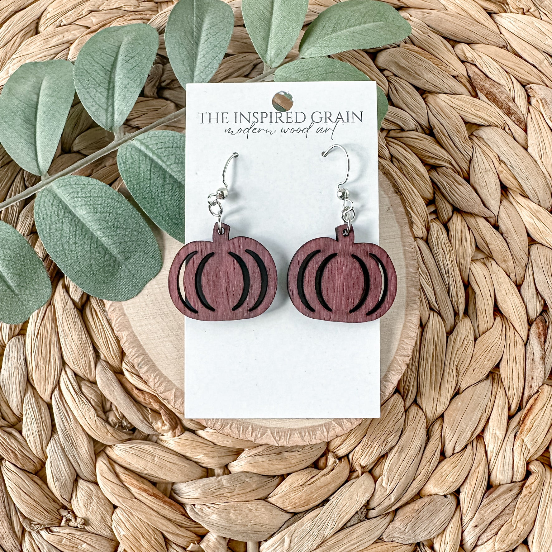 These simple pumpkin earrings are the perfect accessory for your fall outfit! Cut from all natural purple heart wood, this limited edition design is exclusive to The Inspired Grain.