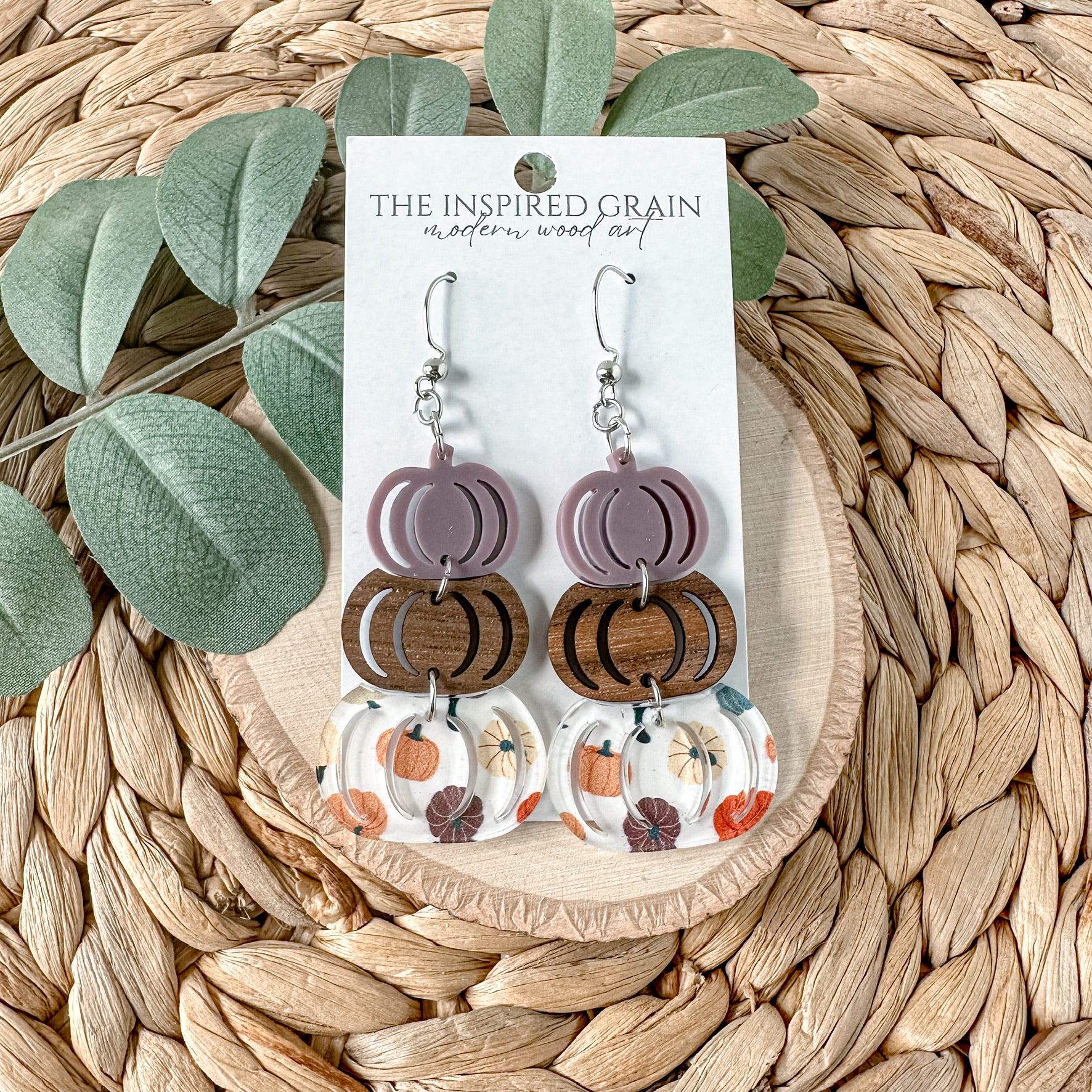 These adorable pumpkin stack earrings are the perfect accessory for your fall outfit! Cut from natural walnut wood and acrylic, this limited edition design is exclusive to The Inspired Grain.