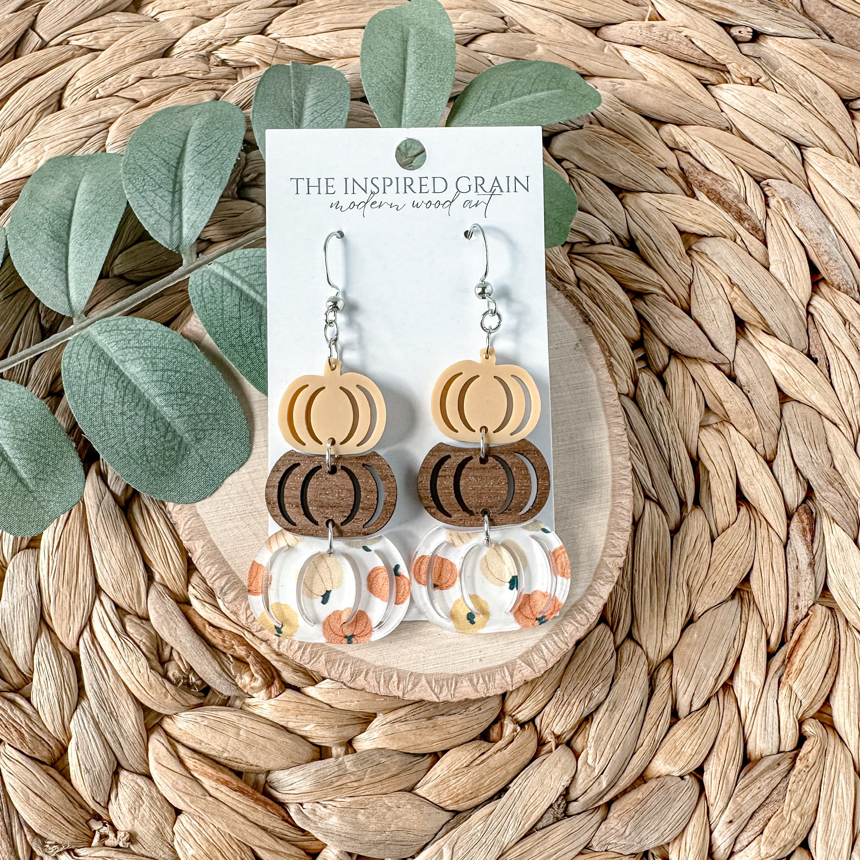 These adorable pumpkin stack earrings are the perfect accessory for your fall outfit! Cut from natural walnut wood and acrylic, this limited edition design is exclusive to The Inspired Grain.